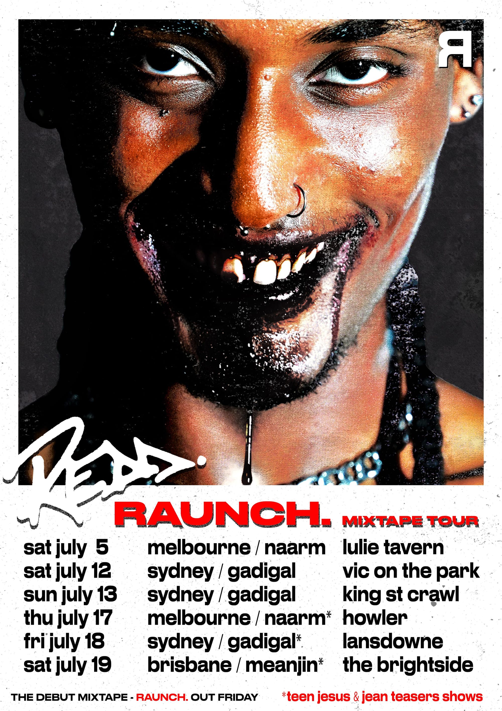What is raunch? It’s a full body shudder. A cracked mirror held up to a world obsessed with polish. In the hands of 19 year old Melbourne phenom REDD., 'RAUNCH' is a manifesto. A sound. A sweaty, glitter smudged scream into the void. It’s also the name of their debut mixtape, a genre-less, fearless 9 track fire starter that bulldozes expectations and slaps a fresh coat of fluorescent paint on what it means to be a pop star in 2025.